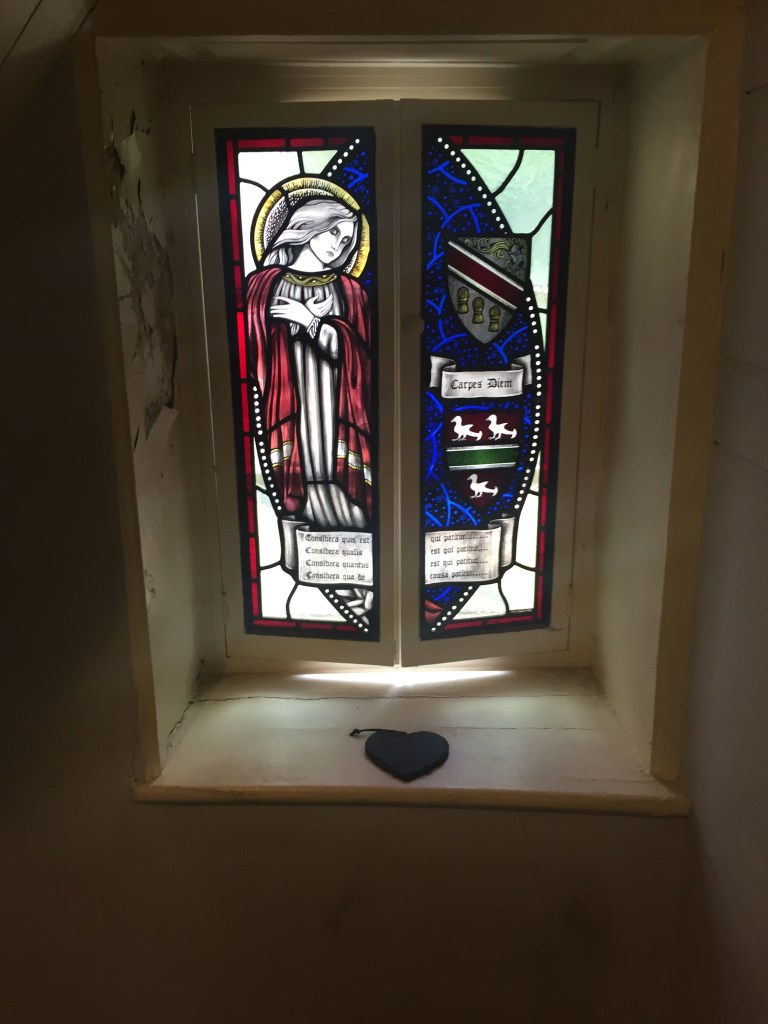 So I gathered that the house had been a secret worship site for catholics. The house itself does show signs of this. A beautiful stained glass window adorns the stairway and we have found several Virgin Mary statues in the undergrowth outside.