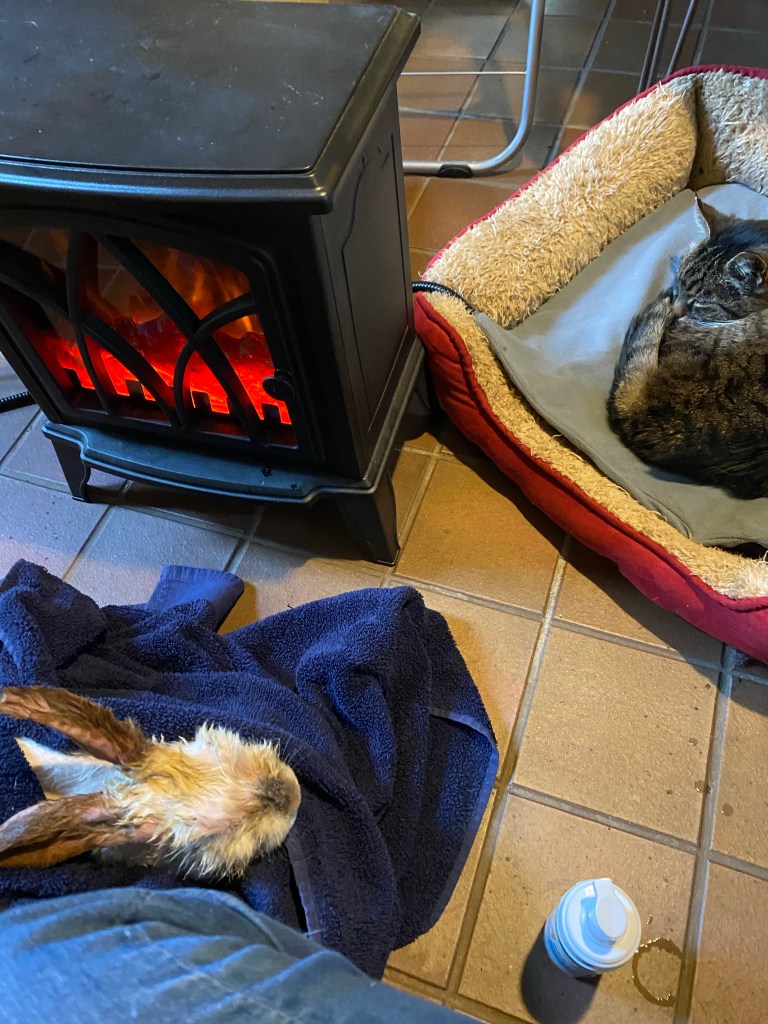 They are both back in the dog crate tonight to thoroughly dry out. They’ve got a big pile of hay and some veg and water. The heater is also positioned near the cage to help them dry out in this cold weather. The only issue is they still look really dirty even after all that!