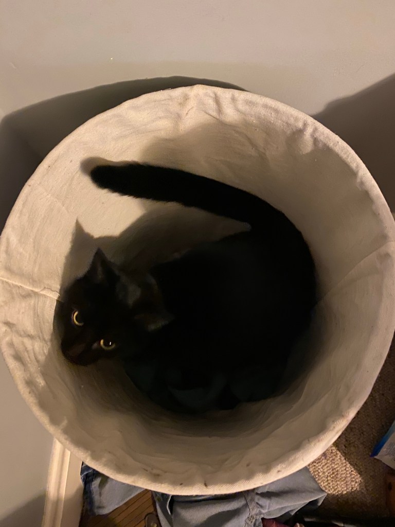 I finally found out today where Cagney had hidden herself during the flood. I searched everywhere that night…well I clearly hadn’t searched everywhere! She has now taken to sleeping in the laundry basket in my bedroom. Really I should have thought of checking there. It’s well documented that children and animals hide in cupboards, under beds and probably in laundry baskets in times of disaster such as floods and fires. Lesson learnt, check all small spaces.