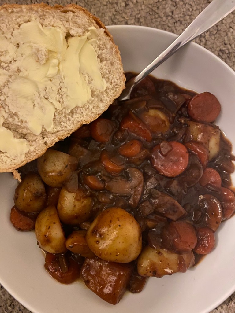 We are still living upstairs and cooking options are limited. I must admit I’m getting sick of things that go in the microwave or toaster. Today I rustled up a pan of stew on the gas hob, which still works when aided by matches. I think that’s why I feel better, a proper meal can really lift the mood.