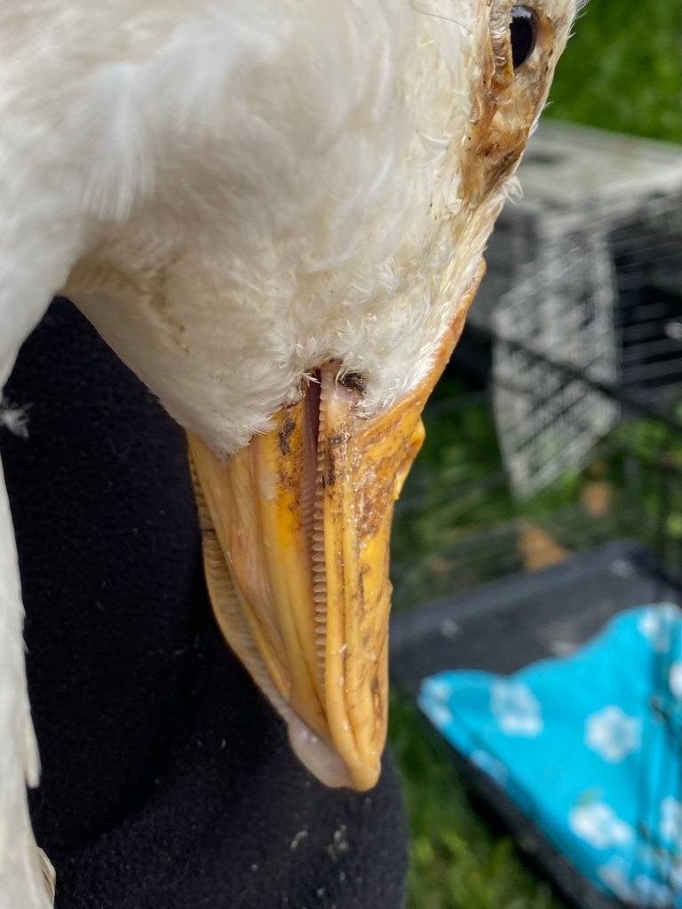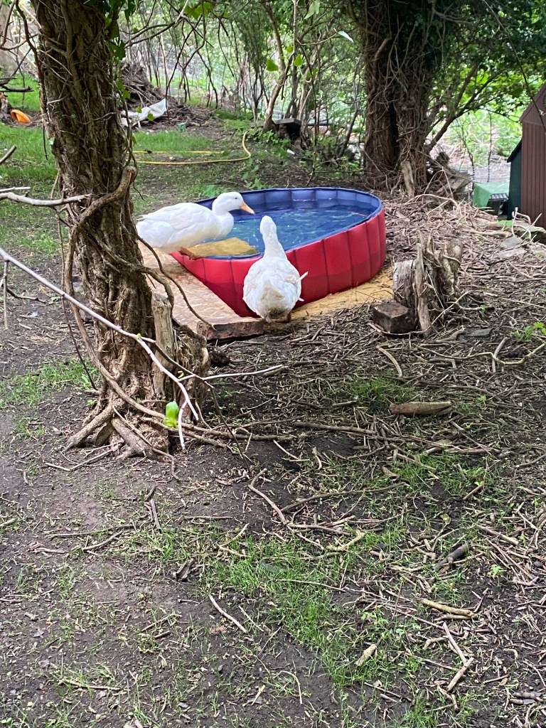 I recently added a few new additions to my family. Two ducks, a cockerel and some more hens. They were in dire circumstances in an area not far from me. Anyway to cut a long story short they are now living with me and Mally. The ducks in particular were in a sorry state. I named them Jemima and puddleduck….of course! Jemima’s eyes are in a terribly sore as she had previously not had access to water in her last abode. So everyday I have been cleaning them, saline dropping and trying to encourage her to dunk her head in water. The ducks are Aylesbury breed and are very much a couple of characters. I get chased around the garden by puddleduck as she’s convinced I constantly have food…she’s right I normally do.