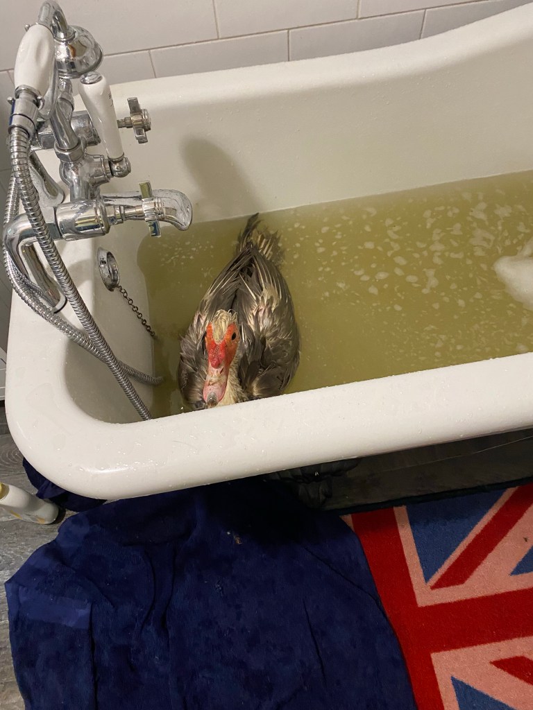 And finally yet another adopted critter to the household….poorly slightly lame old duck George. George was dumped presumably because he was old and was again rescued by Whitby Wildlife Sanctuary. He spends quite a few hours a day laid in his dog bed, he also goes outside for a few hours leg stretch if he is feeling up to it. He’s so lovely and extremely chilled out. He has a daily bath in my bath or in the plastic pool in the garden.